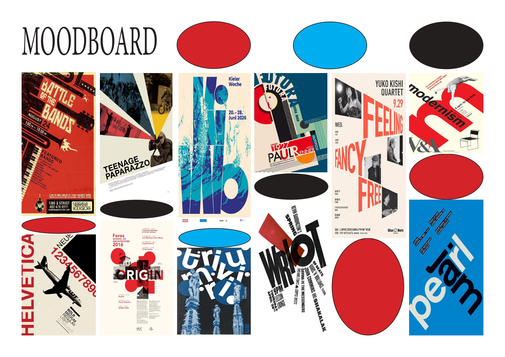 Ce moodboard retrace la phase de recherche esthétique et stratégique du projet. Puisant ses influences dans le courant moderniste, il a permis d'établir une charte visuelle cohérente, basée sur des contrastes colorimétriques marqués et une structure graphique dynamique :